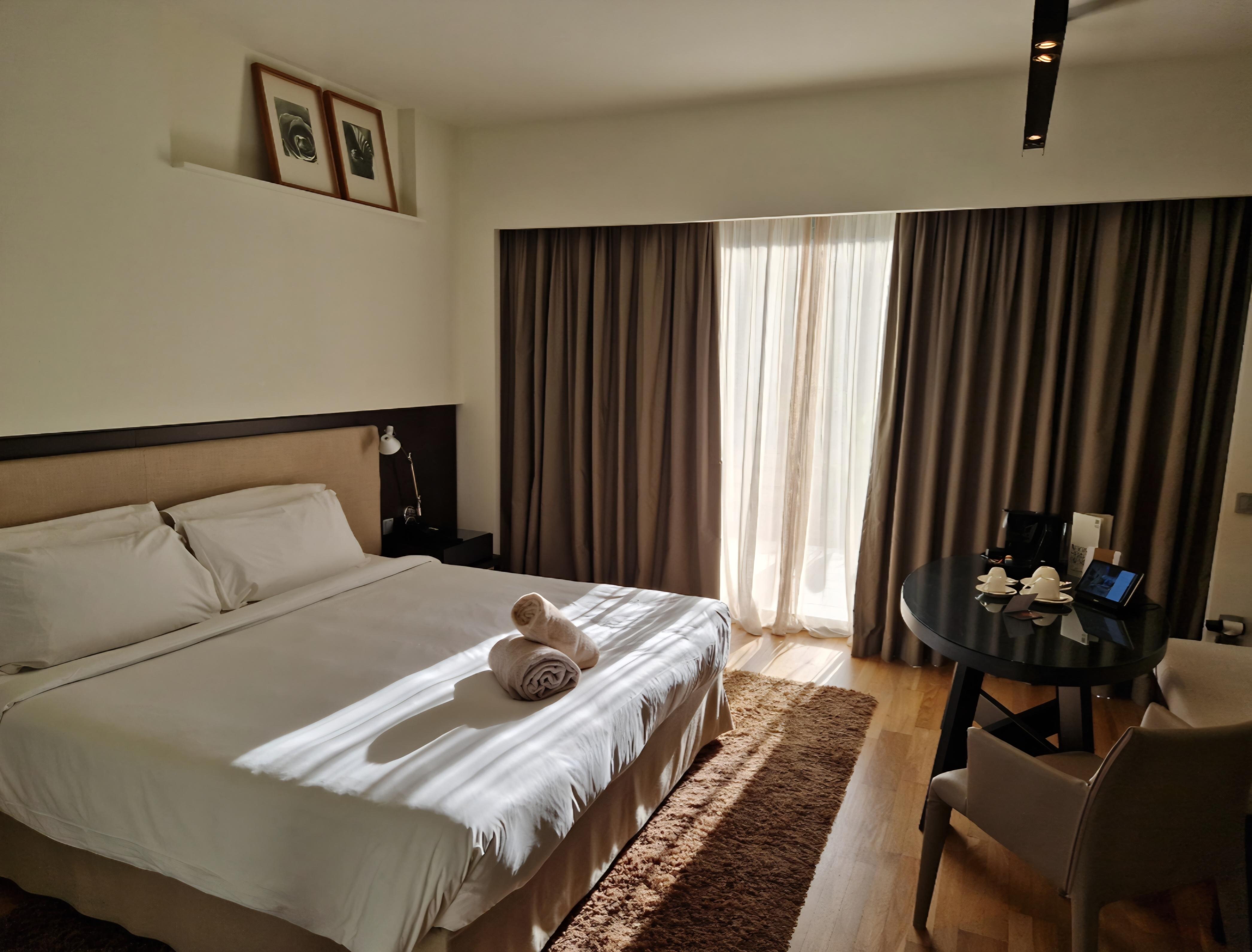 Beautiful hotel on the outskirts of Thessaloniki with ample parking and wonderful pool for the children. We only stayed for a single night on route to Turkey but the facilities were excellent and breakfast was fabulous. Very comfortable beds, quiet and good Bistro restaurant for dinner with excellent food. Scallop risotto starter a must! Very friendly and helpful staff and we will definitely stay again. Recommended.