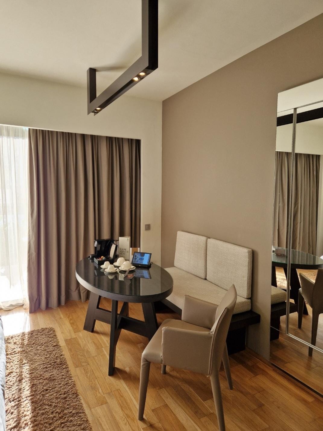 The hotel is spacious and large. The rooms have a nice quality to them and the beds are hard, but extremely comfortable. Each room seems to have a balcony and outdoor space, ours looked into the pool area (opens at 11am). Plenty of storage in the room, fridge and nespresso coffee machine. Be aware you only get 4 pods for the coffee machine and need to pay for any extras. No free water in the room and everything is chargeable. You do get bathrobes, slippers and bathroom amenities. On arrival you are charged for the tax, which for 2 people was €30 for 2 nights. I understand why this happens but it's not the best welcome when you first arrive. We found the staff welcome quite cold and not personable, which is sad. A smile goes a long way and speaks all languages, we didn't get many from the reception. The pool attendant was the most friendly person we came across in our entire stay, well done him. Breakfast is extensive with lots of choice. More nespresso here, so we had lots. The hotel was half empty so it felt quiet which is good for any guest. Location is a little random, only 10 mins from SKG airport, but very little around the hotel to walk too. IKEA is just next door and a LIDL with limited alternative options for restaurants. I would stay again, but might try to find a smaller more intimate option simply for a better level of service from the staff.